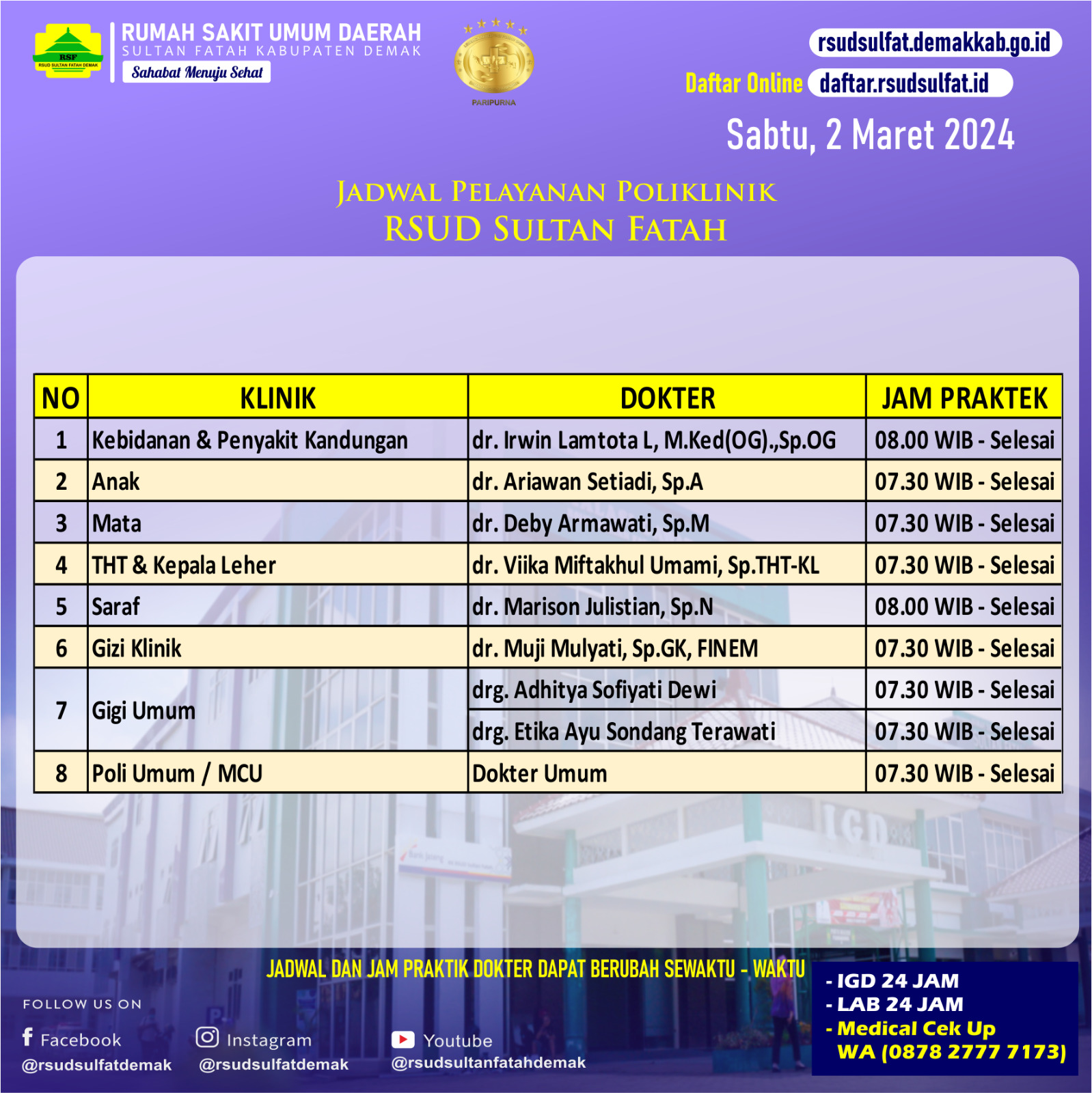 Pelayanan Klinik RSUD Sultan Fatah Kabupaten Demak pada Sabtu, 2 Maret 2024 admin Maret 1, 2024 News 0 Komentar Sahabat Sultan berikut kami informasikan jadwal Pelayanan Klinik RSUD Sultan Fatah Kabupaten Demak pada hari Sabtu, 2 Maret 2024 Navigasi pos Previous Previous post: Pelayanan Klinik RSUD Sultan Fatah Kabupaten Demak pada Jum’at, 1 Maret 2024Next Next post: Pelayanan Klinik RSUD Sultan Fatah Kabupaten Demak pada Senin, 4 Maret 2024 Tinggalkan Balasan Batalkan balasanAlamat email Anda tidak akan dipublikasikan. Ruas yang wajib ditandai *Komentar * Nama * Email * Situs Web Simpan nama, email, dan situs web saya pada peramban ini untuk komentar saya berikutnya. Δ
