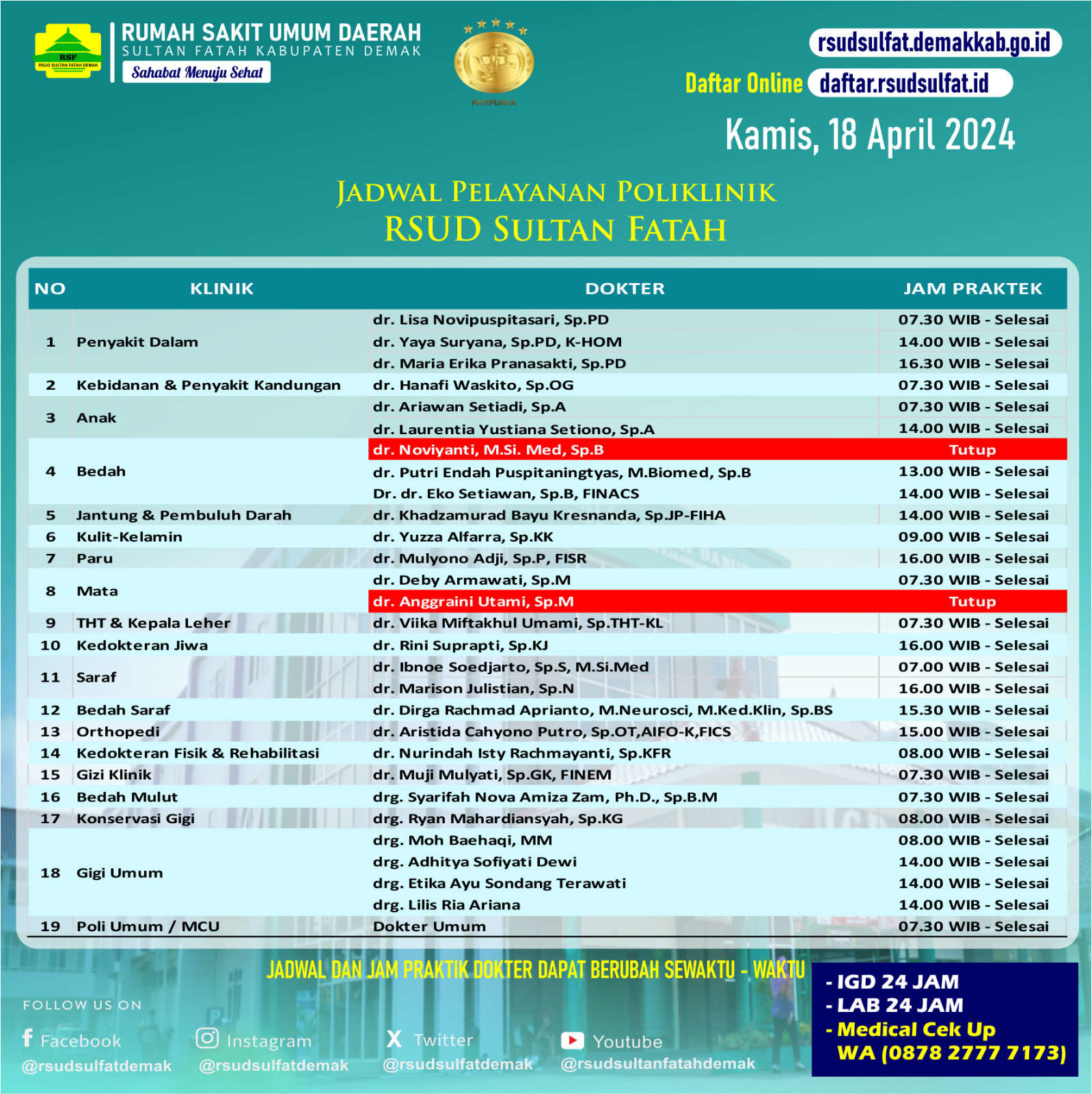 Pelayanan Klinik RSUD Sultan Fatah Kabupaten Demak pada Kamis, 18 April 2024 admin April 17, 2024 News 0 Komentar Sahabat Sultan berikut kami informasikan jadwal Pelayanan Klinik RSUD Sultan Fatah Kabupaten Demak pada hari Kamis, 18 April 2024 Navigasi pos Previous Previous post: APEL PAGI RABU, 17 APRIL 2024Next Next post: Pelayanan Klinik RSUD Sultan Fatah Kabupaten Demak pada Jum’at, 19 April 2024 Tinggalkan Balasan Batalkan balasanAlamat email Anda tidak akan dipublikasikan. Ruas yang wajib ditandai *Komentar * Nama * Email * Situs Web Simpan nama, email, dan situs web saya pada peramban ini untuk komentar saya berikutnya. Δ