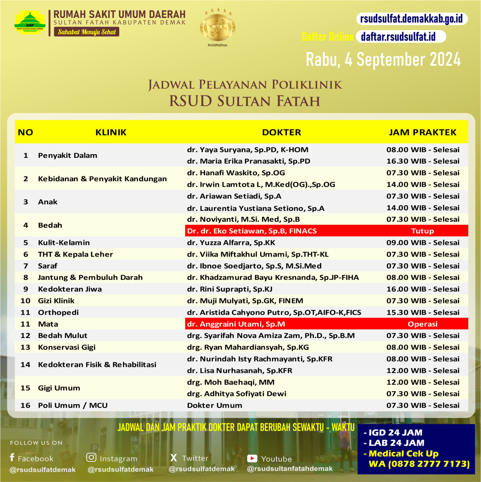 Pelayanan Klinik RSUD Sultan Fatah Kabupaten Demak 4 September 2024 admin September 4, 2024 News 0 Komentar Sahabat Sultan berikut kami informasikan jadwal Pelayanan Klinik RSUD Sultan Fatah Kabupaten Demak pada Rabu, 4 September 2024 Navigasi pos Previous Previous post: Pelayanan Klinik RSUD Sultan Fatah Kabupaten Demak 3 September 2024Next Next post: PERAWATAN PASIEN TUBERKULOSIS PADA SAPI PERAH (SELASA PINTAR PENGUNJUNG RSUD SULTAN FATAH) SELASA, 3 SEPTEMBER 2024 Tinggalkan Balasan Batalkan balasanAlamat email Anda tidak akan dipublikasikan. Ruas yang wajib ditandai *Komentar * Nama * Email * Situs Web Simpan nama, email, dan situs web saya pada peramban ini untuk komentar saya berikutnya. Δ
