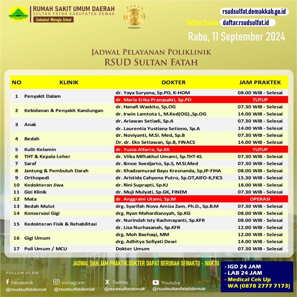 Pelayanan Klinik RSUD Sultan Fatah Kabupaten Demak 11 September 2024 admin September 11, 2024 News 0 Komentar Sahabat Sultan berikut kami informasikan jadwal Pelayanan Klinik RSUD Sultan Fatah Kabupaten Demak pada Rabu, 11 September 2024 Navigasi pos Previous Previous post: Pelayanan Klinik RSUD Sultan Fatah Kabupaten Demak 10 September 2024Next Next post: Pelayanan Klinik RSUD Sultan Fatah Kabupaten Demak 12 September 2024 Tinggalkan Balasan Batalkan balasanAlamat email Anda tidak akan dipublikasikan. Ruas yang wajib ditandai *Komentar * Nama * Email * Situs Web Simpan nama, email, dan situs web saya pada peramban ini untuk komentar saya berikutnya. Δ