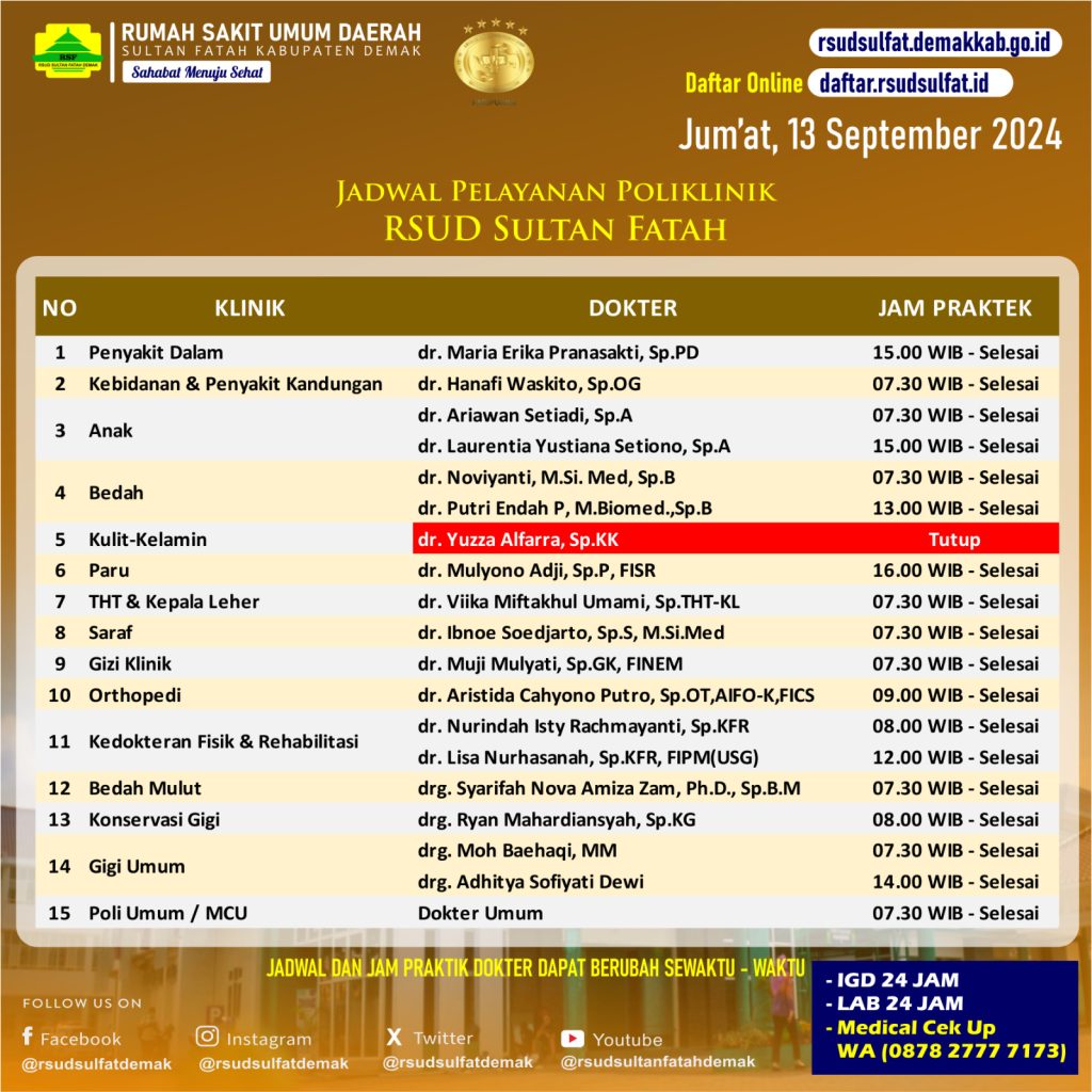 Pelayanan Klinik RSUD Sultan Fatah Kabupaten Demak 13 September 2024 admin September 13, 2024 News 0 Komentar Sahabat Sultan berikut kami informasikan jadwal Pelayanan Klinik RSUD Sultan Fatah Kabupaten Demak pada Jum’at, 13 September 2024 Navigasi pos Previous Previous post: Pelayanan Klinik RSUD Sultan Fatah Kabupaten Demak 12 September 2024Next Next post: Pelayanan Klinik RSUD Sultan Fatah Kabupaten Demak 14 September 2024 Tinggalkan Balasan Batalkan balasanAlamat email Anda tidak akan dipublikasikan. Ruas yang wajib ditandai *Komentar * Nama * Email * Situs Web Simpan nama, email, dan situs web saya pada peramban ini untuk komentar saya berikutnya. Δ