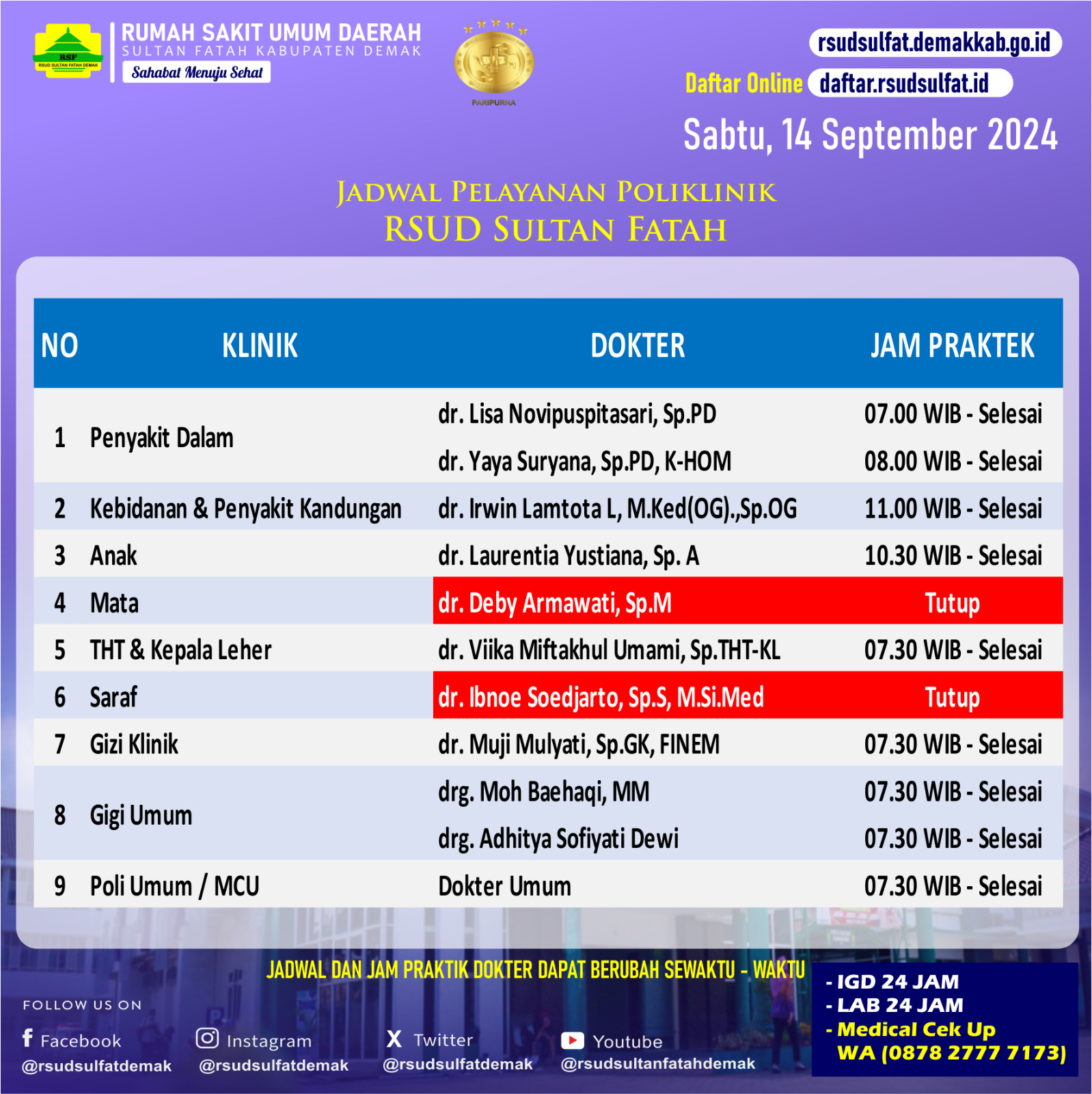 Sahabat Sultan berikut kami informasikan jadwal Pelayanan Klinik RSUD Sultan Fatah Kabupaten Demak pada Sabtu, 14 September 2024