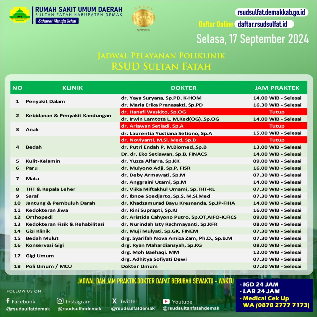 Sahabat Sultan berikut kami informasikan jadwal Pelayanan Klinik RSUD Sultan Fatah Kabupaten Demak pada Selasa, 17 September 2024