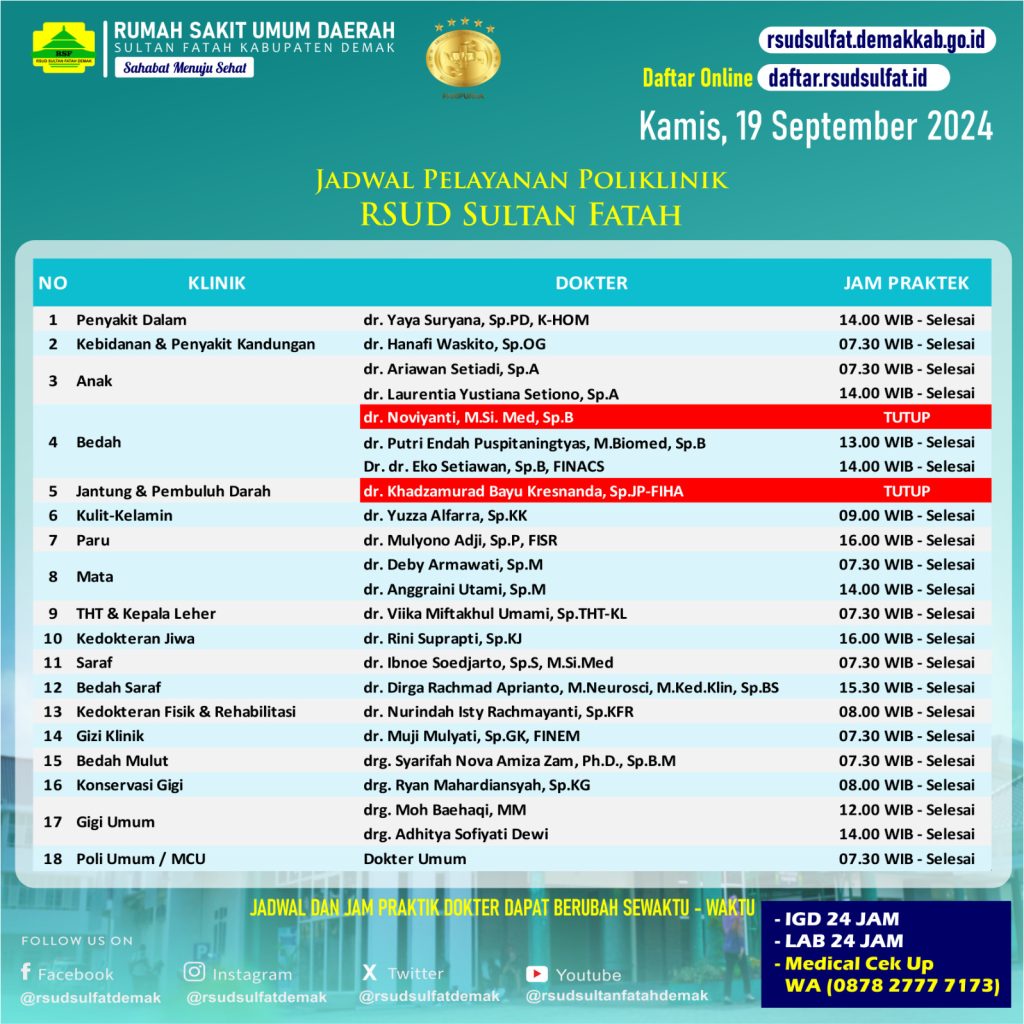 Pelayanan Klinik RSUD Sultan Fatah Kabupaten Demak 19 September 2024 admin September 19, 2024 News 0 Komentar Sahabat Sultan berikut kami informasikan jadwal Pelayanan Klinik RSUD Sultan Fatah Kabupaten Demak pada Kamis, 19 September 2024 Navigasi pos Previous Previous post: Apel pagi Rabu, 18 September 2024Next Next post: SELAMAT BERGABUNG DOKTER Tinggalkan Balasan Batalkan balasanAlamat email Anda tidak akan dipublikasikan. Ruas yang wajib ditandai *Komentar * Nama * Email * Situs Web Simpan nama, email, dan situs web saya pada peramban ini untuk komentar saya berikutnya. Δ