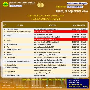 Pelayanan Klinik RSUD Sultan Fatah Kabupaten Demak 20 September 2024 admin September 20, 2024 News 0 Komentar Sahabat Sultan berikut kami informasikan jadwal Pelayanan Klinik RSUD Sultan Fatah Kabupaten Demak pada Jumát, 20 September 2024