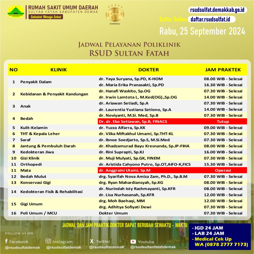 Pelayanan Klinik RSUD Sultan Fatah Kabupaten Demak 25 September 2024 admin September 25, 2024 News 0 Komentar Sahabat Sultan berikut kami informasikan jadwal Pelayanan Klinik RSUD Sultan Fatah Kabupaten Demak pada Rabu, 25 September 2024 Navigasi pos Previous Previous post: Apel pagi Senin, 23 September 2024Next Next post: Pelayanan Klinik RSUD Sultan Fatah Kabupaten Demak 26 September 2024 Tinggalkan Balasan Batalkan balasanAlamat email Anda tidak akan dipublikasikan. Ruas yang wajib ditandai *Komentar * Nama * Email * Situs Web Simpan nama, email, dan situs web saya pada peramban ini untuk komentar saya berikutnya. Δ