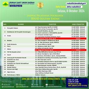 Pelayanan Klinik RSUD Sultan Fatah Kabupaten Demak 8 Oktober 2024 admin Oktober 8, 2024 News 0 Komentar Sahabat Sultan berikut kami informasikan jadwal Pelayanan Klinik RSUD Sultan Fatah Kabupaten Demak pada Selasa, 8 Oktober 2024