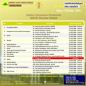 Pelayanan Klinik RSUD Sultan Fatah Kabupaten Demak 9 Oktober 2024 admin Oktober 9, 2024 News 0 Komentar Sahabat Sultan berikut kami informasikan jadwal Pelayanan Klinik RSUD Sultan Fatah Kabupaten Demak pada Rabu, 9 Oktober 2024