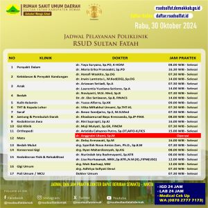 Pelayanan Klinik RSUD Sultan Fatah Kabupaten Demak pada Rabu, 30 Oktober 2024 admin Oktober 30, 2024 News 0 Komentar Sahabat Sultan berikut kami informasikan jadwal Pelayanan Klinik RSUD Sultan Fatah Kabupaten Demak pada Rabu, 30 Oktober 2024