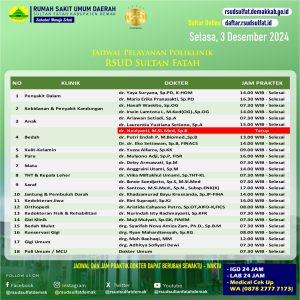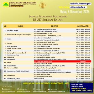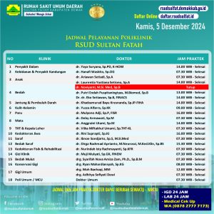 Pelayanan Klinik RSUD Sultan Fatah Kabupaten Demak pada Kamis, 5 Desember 2024 admin Desember 5, 2024 News 0 Komentar Sahabat Sultan berikut kami informasikan jadwal Pelayanan Klinik RSUD Sultan Fatah Kabupaten Demak pada Kamis, 5 Desember 2024