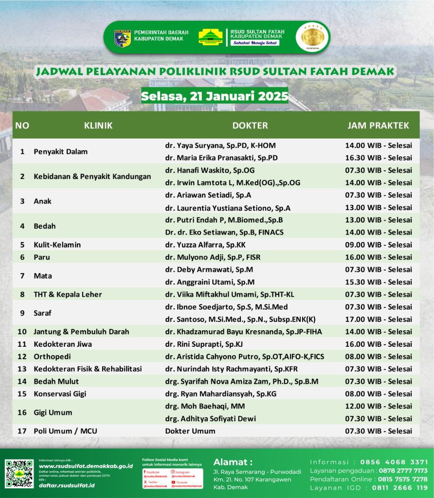 Pelayanan Klinik RSUD Sultan Fatah Kabupaten Demak pada Selasa, 21 Januari 2025 admin Januari 21, 2025 News 0 Komentar Sahabat Sultan berikut kami informasikan jadwal Pelayanan Klinik RSUD Sultan Fatah Kabupaten Demak pada Selasa, 21 Januari 2025 Navigasi pos Previous Previous post: Pelayanan Klinik RSUD Sultan Fatah Kabupaten Demak pada Senin, 20 Januari 2025Next Next post: Pelayanan Klinik RSUD Sultan Fatah Kabupaten Demak pada Kamis, 23 Januari 2025 Tinggalkan Balasan Batalkan balasanAlamat email Anda tidak akan dipublikasikan. Ruas yang wajib ditandai *Komentar * Nama * Email * Situs Web Simpan nama, email, dan situs web saya pada peramban ini untuk komentar saya berikutnya. Δ