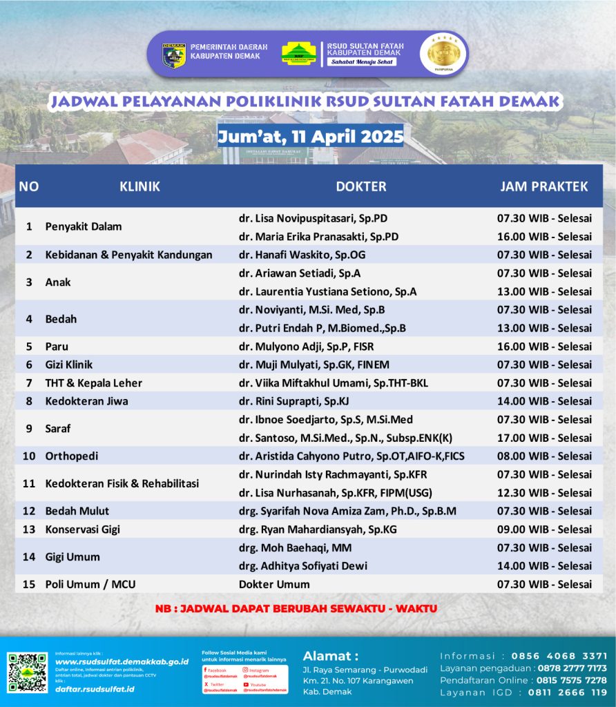 Pelayanan Klinik RSUD Sultan Fatah Kabupaten Demak pada Jum’at, 11 April 2025 admin April 11, 2025 News 0 Komentar Sahabat Sultan berikut kami informasikan jadwal Pelayanan Klinik RSUD Sultan Fatah Kabupaten Demak pada Jum’at, 11 April 2025 Navigasi pos Previous Previous post: Pelayanan Klinik RSUD Sultan Fatah Kabupaten Demak pada Kamis, 10 April 2025Next Next post: Pelayanan Klinik RSUD Sultan Fatah Kabupaten Demak pada Sabtu, 12 April 2025 Tinggalkan Balasan Batalkan balasanAlamat email Anda tidak akan dipublikasikan. Ruas yang wajib ditandai *Komentar * Nama * Email * Situs Web Simpan nama, email, dan situs web saya pada peramban ini untuk komentar saya berikutnya. Δ