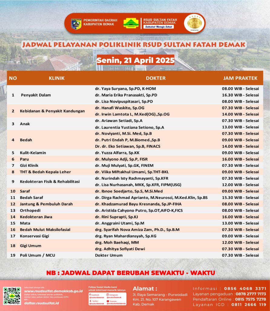 Sahabat Sultan berikut kami informasikan jadwal Pelayanan Klinik RSUD Sultan Fatah Kabupaten Demak pada Senin, 21 April 2025