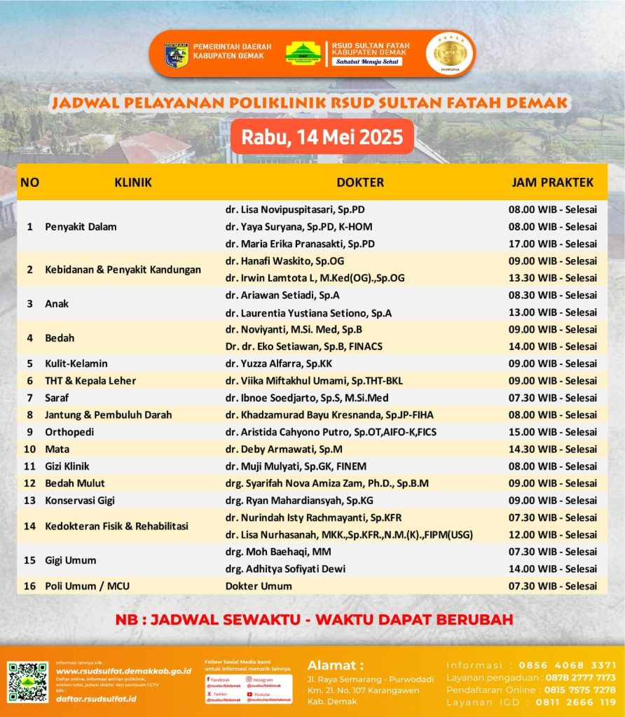 Pelayanan Klinik RSUD Sultan Fatah Kabupaten Demak pada Rabu, 14 Mei 2025 admin Mei 14, 2025 News 0 Komentar Sahabat Sultan berikut kami informasikan jadwal Pelayanan Klinik RSUD Sultan Fatah Kabupaten Demak pada Rabu, 14 Mei 2025 Navigasi pos Previous Previous post: Pelayanan Klinik RSUD Sultan Fatah Kabupaten Demak pada Sabtu,10 Mei 2025Next Next post: Pelayanan Klinik RSUD Sultan Fatah Kabupaten Demak pada Kamis, 15 Mei 2025 Tinggalkan Balasan Batalkan balasanAlamat email Anda tidak akan dipublikasikan. Ruas yang wajib ditandai *Komentar * Nama * Email * Situs Web Simpan nama, email, dan situs web saya pada peramban ini untuk komentar saya berikutnya. Δ