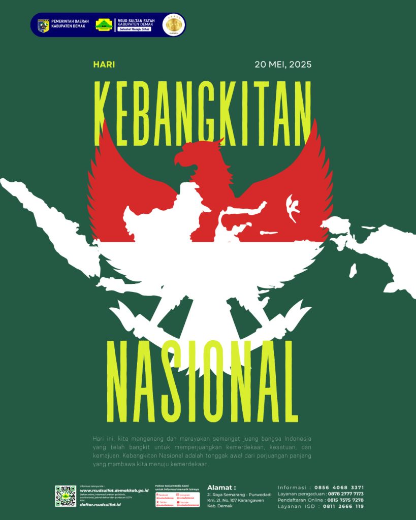 Selamat memperingati Hari Kebangkitan Nasional 2025 admin Mei 20, 2025 News 0 Komentar Dengan semangat kebangkitan, kita wujudkan Indonesia yang adil dan makmur. Ayo bergerak bersama untuk perubahan positif. Navigasi pos Previous Previous post: Pelayanan Klinik RSUD Sultan Fatah Kabupaten Demak pada Selasa, 20 Mei 2025Next Next post: Pelayanan Klinik RSUD Sultan Fatah Kabupaten Demak pada Rabu,21 Mei 2025 Tinggalkan Balasan Batalkan balasanAlamat email Anda tidak akan dipublikasikan. Ruas yang wajib ditandai *Komentar * Nama * Email * Situs Web Simpan nama, email, dan situs web saya pada peramban ini untuk komentar saya berikutnya. Δ