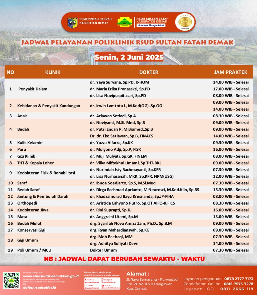 Sahabat Sultan berikut kami informasikan jadwal Pelayanan Klinik RSUD Sultan Fatah Kabupaten Demak pada Senin, 2 Juni 2025