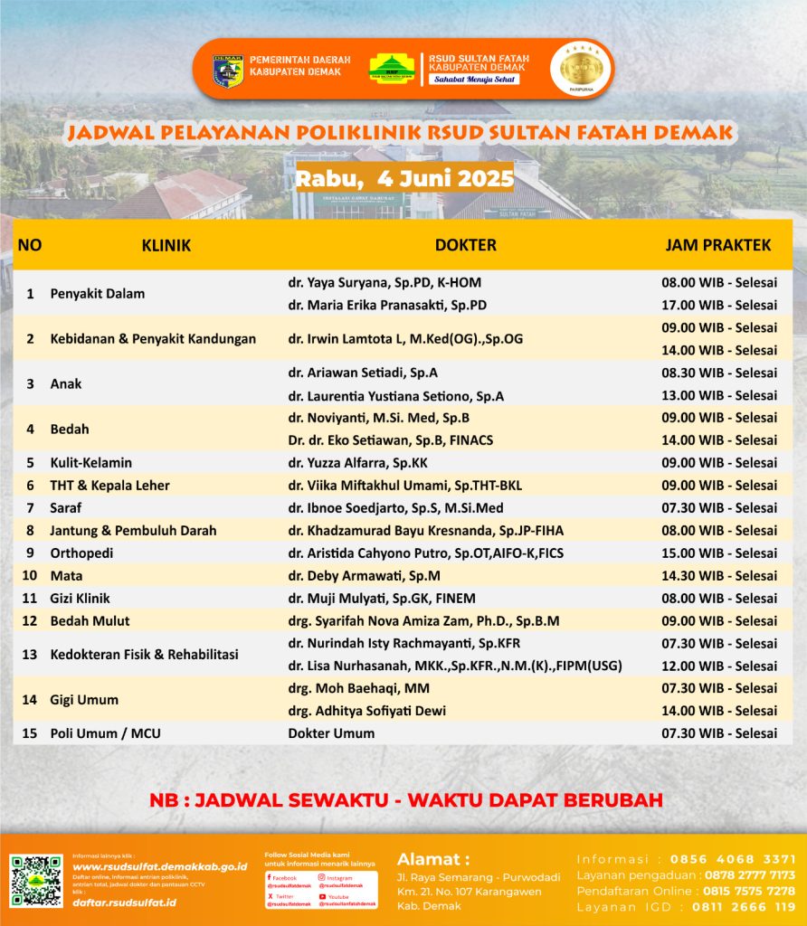Pelayanan Klinik RSUD Sultan Fatah Kabupaten Demak pada Rabu, 4 Juni 2025 admin Juni 4, 2025 News 0 Komentar Sahabat Sultan berikut kami informasikan jadwal Pelayanan Klinik RSUD Sultan Fatah Kabupaten Demak pada Rabu, 4 Juni 2025 Navigasi pos Previous Previous post: Pelayanan Klinik RSUD Sultan Fatah Kabupaten Demak pada Selasa, 3 Juni 2025 Next Next post: Pelayanan Klinik RSUD Sultan Fatah Kabupaten Demak pada Kamis, 6 Juni 2025 Tinggalkan Balasan Batalkan balasanAlamat email Anda tidak akan dipublikasikan. Ruas yang wajib ditandai *Komentar * Nama * Email * Situs Web Simpan nama, email, dan situs web saya pada peramban ini untuk komentar saya berikutnya. Δ