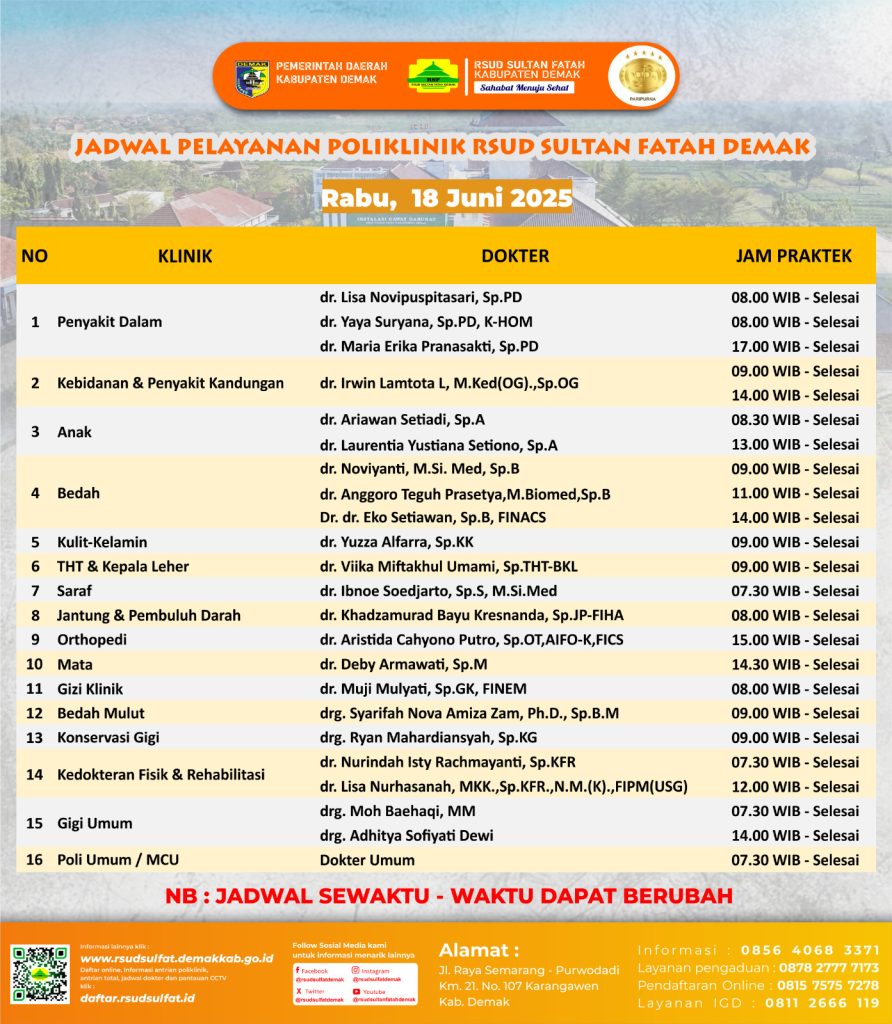 Pelayanan Klinik RSUD Sultan Fatah Kabupaten Demak pada Rabu,18 Juni 2025 admin Juni 17, 2025 News 0 Komentar Sahabat Sultan berikut kami informasikan jadwal Pelayanan Klinik RSUD Sultan Fatah Kabupaten Demak pada Rabu,18 Juni 2025 Navigasi pos Previous Previous post: Pelayanan Klinik RSUD Sultan Fatah Kabupaten Demak pada Selasa,17 Juni 2025Next Next post: Pelayanan Klinik RSUD Sultan Fatah Kabupaten Demak pada Kamis,19 Juni 2025 Tinggalkan Balasan Batalkan balasanAlamat email Anda tidak akan dipublikasikan. Ruas yang wajib ditandai *Komentar * Nama * Email * Situs Web Simpan nama, email, dan situs web saya pada peramban ini untuk komentar saya berikutnya. Δ