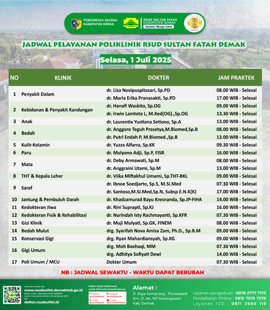 Sahabat Sultan berikut kami informasikan jadwal Pelayanan Klinik RSUD Sultan Fatah Kabupaten Demak pada Selasa, 1 Juli 2025 bersama nexonbet