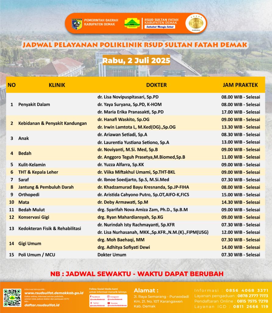 Sahabat Sultan berikut kami informasikan jadwal Pelayanan Klinik RSUD Sultan Fatah Kabupaten Demak pada Rabu, 2 Juli 2025 bersama slot spadegaming
