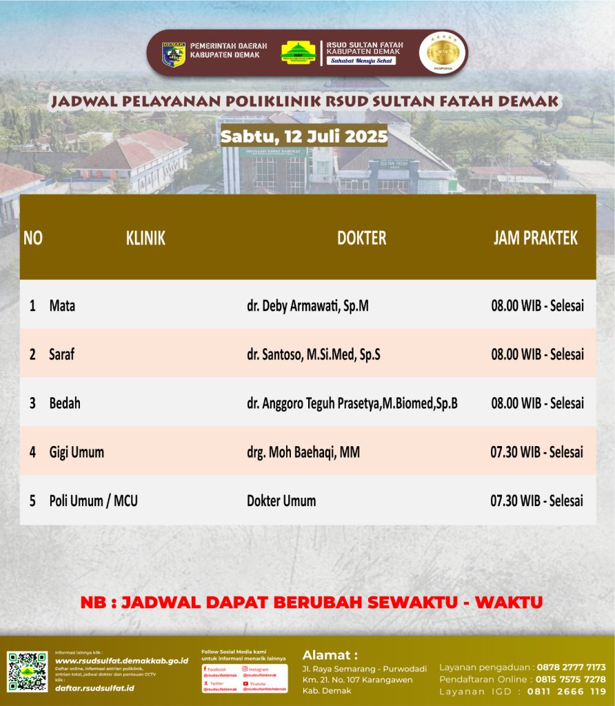 Sahabat Sultan berikut kami informasikan jadwal Pelayanan Klinik RSUD Sultan Fatah Kabupaten Demak pada Sabtu,12 Juli 2025 bersama togel nex4d