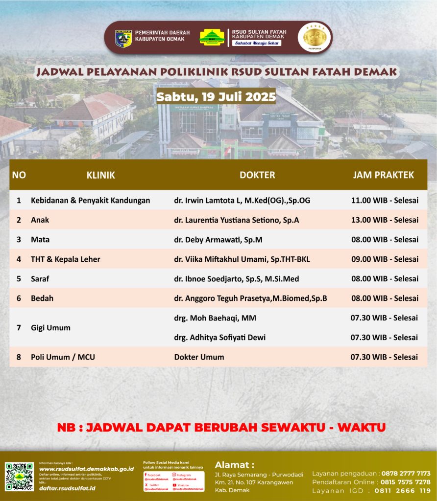 Pelayanan Klinik RSUD Sultan Fatah Kabupaten Demak pada Sabtu,19 Juli 2025 admin Juli 19, 2025 Uncategorized 0 Komentar Sahabat Sultan berikut kami informasikan jadwal Pelayanan Klinik RSUD Sultan Fatah Kabupaten Demak pada Sabtu,19 Juli 2025 Navigasi pos Previous Previous post: Pelayanan Klinik RSUD Sultan Fatah Kabupaten Demak pada Jum’at,18 Juli 2025 .Next Next post: Pelayanan Klinik RSUD Sultan Fatah Kabupaten Demak pada Senin,21 Juli 2025 Tinggalkan Balasan Batalkan balasanAlamat email Anda tidak akan dipublikasikan. Ruas yang wajib ditandai *Komentar * Nama * Email * Situs Web Simpan nama, email, dan situs web saya pada peramban ini untuk komentar saya berikutnya. Δ