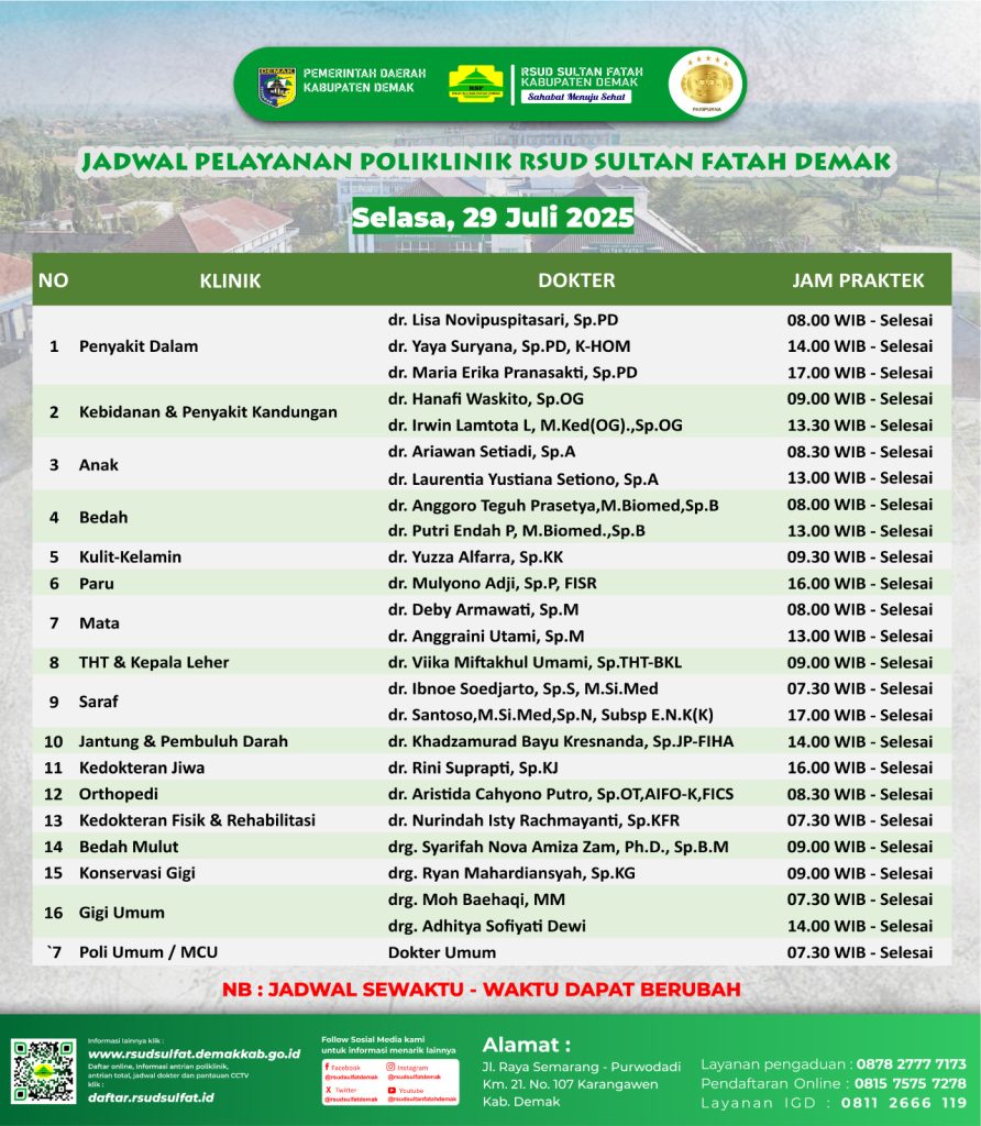 Pelayanan Klinik RSUD Sultan Fatah Kabupaten Demak pada Selasa, 29 Juli 2025 admin Juli 29, 2025 News 0 Komentar Sahabat Sultan berikut kami informasikan jadwal Pelayanan Klinik RSUD Sultan Fatah Kabupaten Demak pada Selasa, 29 Juli 2025 Navigasi pos Previous Previous post: Pelayanan Klinik RSUD Sultan Fatah Kabupaten Demak pada Senin, 28 Juli 2025Next Next post: Pelayanan Klinik RSUD Sultan Fatah Kabupaten Demak pada Rabu, 30 Juli 2025 Tinggalkan Balasan Batalkan balasanAlamat email Anda tidak akan dipublikasikan. Ruas yang wajib ditandai *Komentar * Nama * Email * Situs Web Simpan nama, email, dan situs web saya pada peramban ini untuk komentar saya berikutnya. Δ