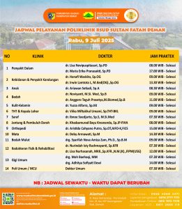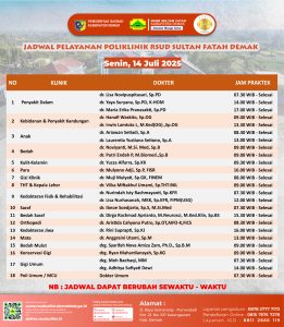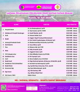 Pelayanan Klinik RSUD Sultan Fatah Kabupaten Demak pada Kamis, 10 Juli 2025 admin Juli 10, 2025 News 0 Komentar Sahabat Sultan berikut kami informasikan jadwal Pelayanan Klinik RSUD Sultan Fatah Kabupaten Demak pada Kamis, 10 Juli 2025.