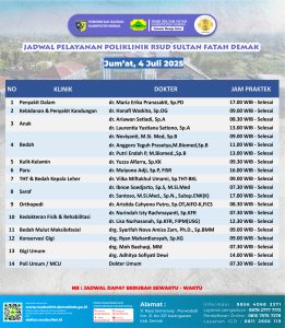 Pelayanan Klinik RSUD Sultan Fatah Kabupaten Demak pada Sabtu,5 Juli 2025 admin Juli 5, 2025 News 0 Komentar Sahabat Sultan berikut kami informasikan jadwal Pelayanan Klinik RSUD Sultan Fatah Kabupaten Demak pada Sabtu,5 Juli 2025 bersama ws168