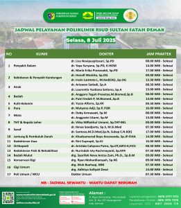 Pelayanan Klinik RSUD Sultan Fatah Kabupaten Demak pada Selasa, 1 Juli 2025 admin Juli 1, 2025 News 0 Komentar Sahabat Sultan berikut kami informasikan jadwal Pelayanan Klinik RSUD Sultan Fatah Kabupaten Demak pada Selasa, 1 Juli 2025 bersama nexonbet