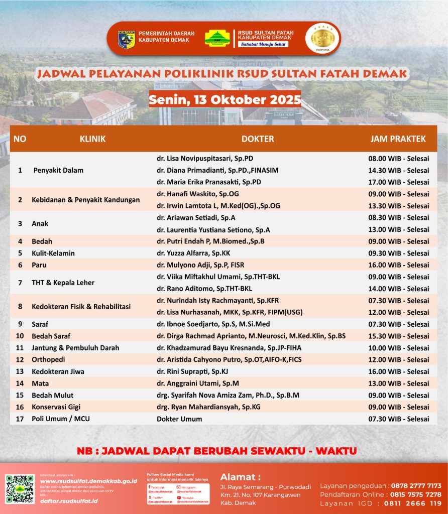 Sahabat Sultan berikut kami informasikan jadwal Pelayanan Klinik RSUD Sultan Fatah Kabupaten Demak pada Senin,13 Oktober 2025