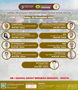 Pelayanan Klinik RSUD Sultan Fatah Kabupaten Demak pada Sabtu,29 November 2025 admin November 29, 2025 News 0 Komentar Sahabat Sultan berikut kami informasikan jadwal Pelayanan Klinik RSUD Sultan Fatah Kabupaten Demak pada Sabtu,29 November 2025