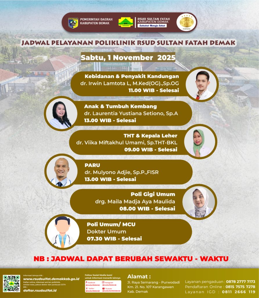 Pelayanan Klinik RSUD Sultan Fatah Kabupaten Demak pada Sabtu, 1 November 2025 admin November 1, 2025 News 0 Komentar Sahabat Sultan berikut kami informasikan jadwal Pelayanan Klinik RSUD Sultan Fatah Kabupaten Demak pada Sabtu, 1 November 2025 Navigasi pos Previous Previous post: Pelayanan Klinik RSUD Sultan Fatah Kabupaten Demak pada Jumát,31 Oktober 2025 Next Next post: Pelayanan Klinik RSUD Sultan Fatah Kabupaten Demak pada Senin,3 November 2025 Tinggalkan Balasan Batalkan balasanAlamat email Anda tidak akan dipublikasikan. Ruas yang wajib ditandai *Komentar * Nama * Email * Situs Web Simpan nama, email, dan situs web saya pada peramban ini untuk komentar saya berikutnya. Δ