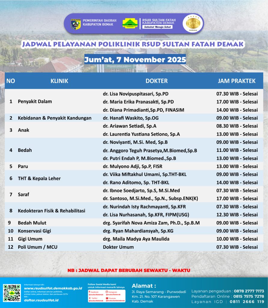 Pelayanan Klinik RSUD Sultan Fatah Kabupaten Demak pada Jumát,7 November 2025 admin November 7, 2025 News 0 Komentar Sahabat Sultan berikut kami informasikan jadwal Pelayanan Klinik RSUD Sultan Fatah Kabupaten Demak pada Jumát,7 November 2025 Navigasi pos Previous Previous post: Pelayanan Klinik RSUD Sultan Fatah Kabupaten Demak pada Rabu, 5 November 2025Next Next post: Pelayanan Klinik RSUD Sultan Fatah Kabupaten Demak pada Sabtu,8 November 2025 Tinggalkan Balasan Batalkan balasanAlamat email Anda tidak akan dipublikasikan. Ruas yang wajib ditandai *Komentar * Nama * Email * Situs Web Simpan nama, email, dan situs web saya pada peramban ini untuk komentar saya berikutnya. Δ
