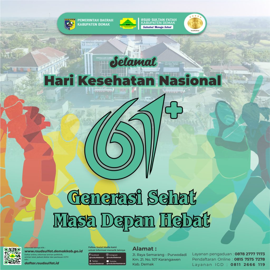 Selamat memperingati Hari Kesehatan Nasional ke -61 admin November 12, 2025 News 0 Komentar Mari wujudkan generasi kuat melalui kebiasaan hidup sehat Navigasi pos Previous Previous post: Pelayanan Klinik RSUD Sultan Fatah Kabupaten Demak pada Rabu,12 November 2025Next Next post: Pelayanan Klinik RSUD Sultan Fatah Kabupaten Demak pada Kamis,13 November 2025 Tinggalkan Balasan Batalkan balasanAlamat email Anda tidak akan dipublikasikan. Ruas yang wajib ditandai *Komentar * Nama * Email * Situs Web Simpan nama, email, dan situs web saya pada peramban ini untuk komentar saya berikutnya. Δ