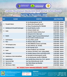 Pelayanan Klinik RSUD Sultan Fatah Kabupaten Demak pada Jumát,14 November 2025 admin November 14, 2025 News 0 Komentar Sahabat Sultan berikut kami informasikan jadwal Pelayanan Klinik RSUD Sultan Fatah Kabupaten Demak pada Jumát,14 November 2025