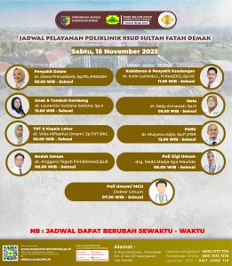Pelayanan Klinik RSUD Sultan Fatah Kabupaten Demak pada Sabtu,15 November 2025 admin November 15, 2025 News 0 Komentar Sahabat Sultan berikut kami informasikan jadwal Pelayanan Klinik RSUD Sultan Fatah Kabupaten Demak pada Sabtu,15 November 2025