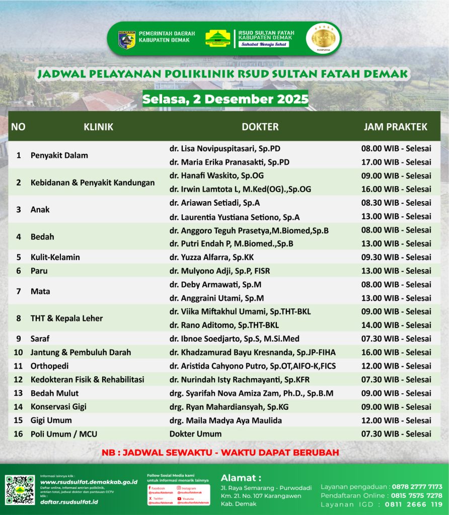 Pelayanan Klinik RSUD Sultan Fatah Kabupaten Demak pada 2 Desember 2025 admin Desember 2, 2025 News 0 Komentar Sahabat Sultan berikut kami informasikan jadwal Pelayanan Klinik RSUD Sultan Fatah Kabupaten Demak pada 2 Desember 2025 Navigasi pos Previous Previous post: Pelayanan Klinik RSUD Sultan Fatah Kabupaten Demak pada 1 Desember 2025Next Next post: Pelayanan Klinik RSUD Sultan Fatah Kabupaten Demak pada 3 Desember 2025 Tinggalkan Balasan Batalkan balasanAlamat email Anda tidak akan dipublikasikan. Ruas yang wajib ditandai *Komentar * Nama * Email * Situs Web Simpan nama, email, dan situs web saya pada peramban ini untuk komentar saya berikutnya. Δ