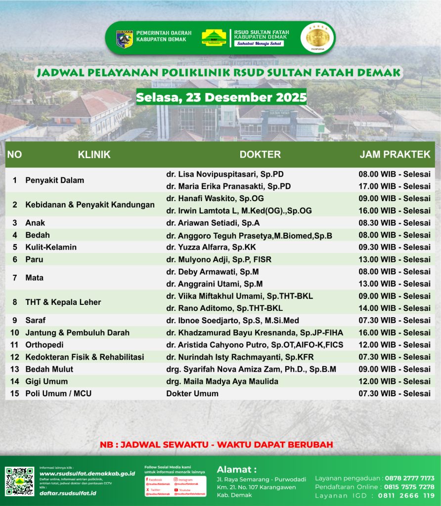 Pelayanan Klinik RSUD Sultan Fatah Kabupaten Demak pada Selasa,23 Desember 2025 admin Desember 23, 2025 News 0 Komentar Sahabat Sultan berikut kami informasikan jadwal Pelayanan Klinik RSUD Sultan Fatah Kabupaten Demak pada Selasa,23 Desember 2025 Navigasi pos Previous Previous post: Pelayanan Klinik RSUD Sultan Fatah Kabupaten Demak pada Senin,22 Desember 2025Next Next post: Pelayanan Klinik RSUD Sultan Fatah Kabupaten Demak pada Rabu,24 Desember 2025 Tinggalkan Balasan Batalkan balasanAlamat email Anda tidak akan dipublikasikan. Ruas yang wajib ditandai *Komentar * Nama * Email * Situs Web Simpan nama, email, dan situs web saya pada peramban ini untuk komentar saya berikutnya. Δ