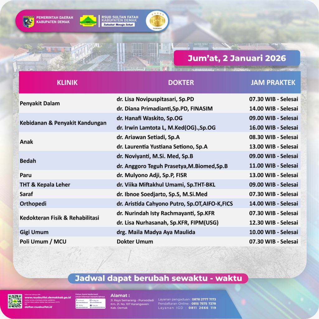 Pelayanan Klinik RSUD Sultan Fatah Kabupaten Demak pada Jumát,2 Januari 2026 admin Januari 2, 2026 News 0 Komentar Sahabat Sultan berikut kami informasikan jadwal Pelayanan Klinik RSUD Sultan Fatah Kabupaten Demak pada Jumát,2 Januari 2026 Navigasi pos Previous Previous post: Pelayanan Klinik RSUD Sultan Fatah Kabupaten Demak pada Rabu,31 Desember 2025Next Next post: Pelayanan Klinik RSUD Sultan Fatah Kabupaten Demak pada Sabtu,3 Januari 2026 Tinggalkan Balasan Batalkan balasanAlamat email Anda tidak akan dipublikasikan. Ruas yang wajib ditandai *Komentar * Nama * Email * Situs Web Simpan nama, email, dan situs web saya pada peramban ini untuk komentar saya berikutnya. Δ