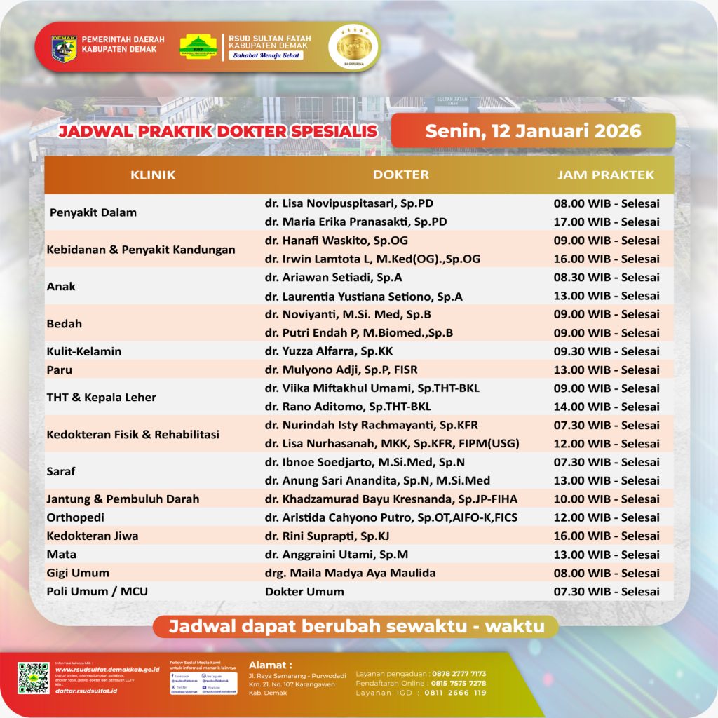Pelayanan Klinik RSUD Sultan Fatah Kabupaten Demak pada Senin,12 Januari 2026 admin Januari 12, 2026 News 0 Komentar Sahabat Sultan berikut kami informasikan jadwal Pelayanan Klinik RSUD Sultan Fatah Kabupaten Demak pada Senin,12 Januari 2026 Navigasi pos Previous Previous post: Pelayanan Klinik RSUD Sultan Fatah Kabupaten Demak pada Sabtu,10 Januari 2026Next Next post: Pelayanan Klinik RSUD Sultan Fatah Kabupaten Demak pada Selasa,13 Januari 2026 Tinggalkan Balasan Batalkan balasanAlamat email Anda tidak akan dipublikasikan. Ruas yang wajib ditandai *Komentar * Nama * Email * Situs Web Simpan nama, email, dan situs web saya pada peramban ini untuk komentar saya berikutnya. Δ