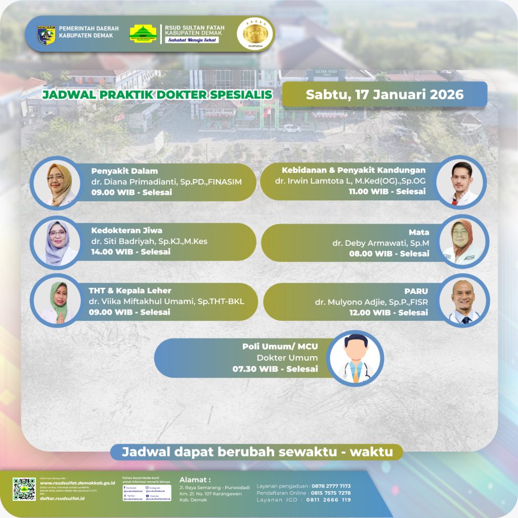 Sahabat Sultan berikut kami informasikan jadwal Pelayanan Klinik RSUD Sultan Fatah Kabupaten Demak pada Jumát,17 Januari 2026