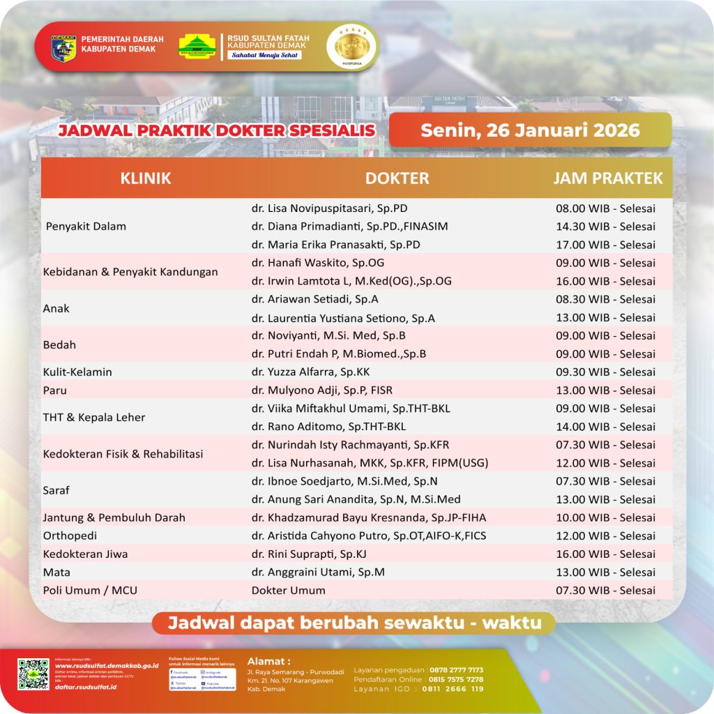 Pelayanan Klinik RSUD Sultan Fatah Kabupaten Demak pada Senin,26 Januari 2026 admin Januari 26, 2026 News 0 Komentar Sahabat Sultan berikut kami informasikan jadwal Pelayanan Klinik RSUD Sultan Fatah Kabupaten Demak pada Senin,26 Januari 2026 . Navigasi pos Previous Previous post: Pelayanan Klinik RSUD Sultan Fatah Kabupaten Demak pada Sabtu,24 Januari 2026 Next Next post: Pelayanan Klinik RSUD Sultan Fatah Kabupaten Demak pada Selasa, 27 Januari 2026 Tinggalkan Balasan Batalkan balasanAlamat email Anda tidak akan dipublikasikan. Ruas yang wajib ditandai *Komentar * Nama * Email * Situs Web Simpan nama, email, dan situs web saya pada peramban ini untuk komentar saya berikutnya. Δ