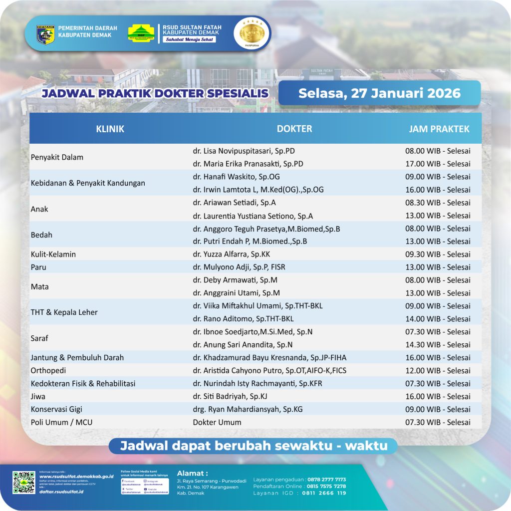 Pelayanan Klinik RSUD Sultan Fatah Kabupaten Demak pada Selasa, 27 Januari 2026 admin Januari 27, 2026 News 0 Komentar Sahabat Sultan berikut kami informasikan jadwal Pelayanan Klinik RSUD Sultan Fatah Kabupaten Demak pada Selasa, 27 Januari 2026 Navigasi pos Previous Previous post: Pelayanan Klinik RSUD Sultan Fatah Kabupaten Demak pada Senin,26 Januari 2026Next Next post: Pelayanan Klinik RSUD Sultan Fatah Kabupaten Demak pada Rabu,28 Januari 2026 Tinggalkan Balasan Batalkan balasanAlamat email Anda tidak akan dipublikasikan. Ruas yang wajib ditandai *Komentar * Nama * Email * Situs Web Simpan nama, email, dan situs web saya pada peramban ini untuk komentar saya berikutnya. Δ