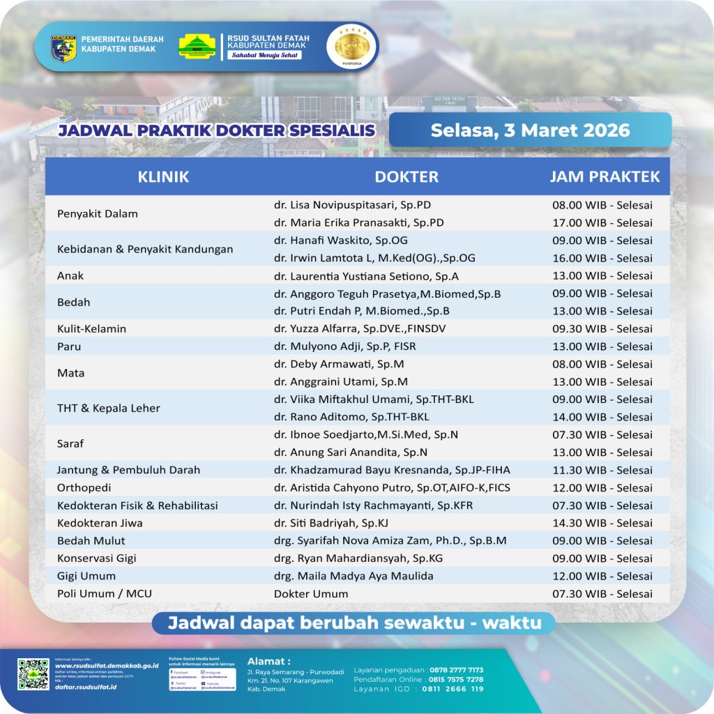 Pelayanan Klinik RSUD Sultan Fatah Kabupaten Demak pada Selasa,3 Maret 2026 admin Maret 3, 2026 News 0 Komentar Sahabat Sultan berikut kami informasikan jadwal Pelayanan Klinik RSUD Sultan Fatah Kabupaten Demak pada Selasa,3 Maret 2026 Navigasi pos Previous Previous post: Pelayanan Klinik RSUD Sultan Fatah Kabupaten Demak pada Kamis,12 Februari 2026Next Next post: Pelayanan Klinik RSUD Sultan Fatah Kabupaten Demak pada Kamis,5 Maret 2026 Tinggalkan Balasan Batalkan balasanAlamat email Anda tidak akan dipublikasikan. Ruas yang wajib ditandai *Komentar * Nama * Email * Situs Web Simpan nama, email, dan situs web saya pada peramban ini untuk komentar saya berikutnya. Δ
