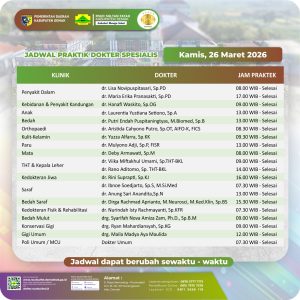 Pelayanan Klinik RSUD Sultan Fatah Kabupaten Demak pada Kamis,26 Maret 2026 admin Maret 26, 2026 News 0 Komentar Sahabat Sultan berikut kami informasikan jadwal Pelayanan Klinik RSUD Sultan Fatah Kabupaten Demak pada Kamis,26 Maret 2026