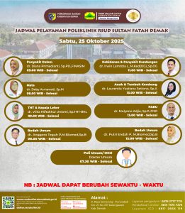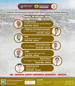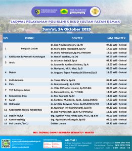Pelayanan Klinik RSUD Sultan Fatah Kabupaten Demak pada Sabtu,18 Oktober 2025 admin Oktober 18, 2025 News 0 Komentar Sahabat Sultan berikut kami informasikan jadwal Pelayanan Klinik RSUD Sultan Fatah Kabupaten Demak pada Sabtu,18 Oktober 2025
