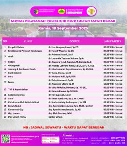 Pelayanan Klinik RSUD Sultan Fatah Kabupaten Demak pada Kamis, 18 September 2025 admin September 18, 2025 News 0 Komentar Sahabat Sultan berikut kami informasikan jadwal Pelayanan Klinik RSUD Sultan Fatah Kabupaten Demak pada Kamis, 18 September 2025