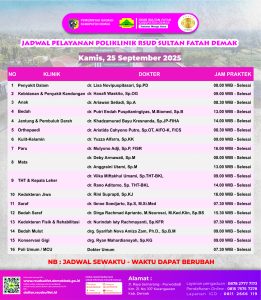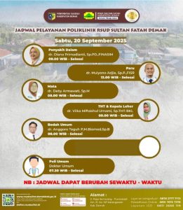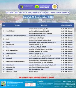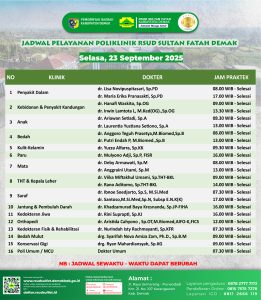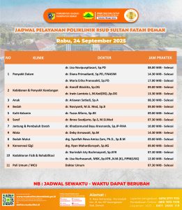 Pelayanan Klinik RSUD Sultan Fatah Kabupaten Demak pada Rabu, 24 September 2025Â admin September 24, 2025 News 0 Komentar Sahabat Sultan berikut kami informasikan jadwal Pelayanan Klinik RSUD Sultan Fatah Kabupaten Demak pada Rabu, 24 September 2025