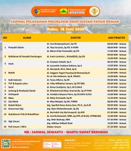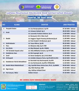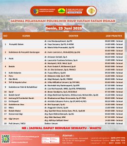 Pelayanan Klinik RSUD Sultan Fatah Kabupaten Demak pada Sabtu, 21 Juni 2025Â admin Juni 21, 2025 News 0 Komentar Sahabat Sultan berikut kami informasikan jadwal Pelayanan Klinik RSUD Sultan Fatah Kabupaten Demak pada Sabtu, 21 Juni 2025